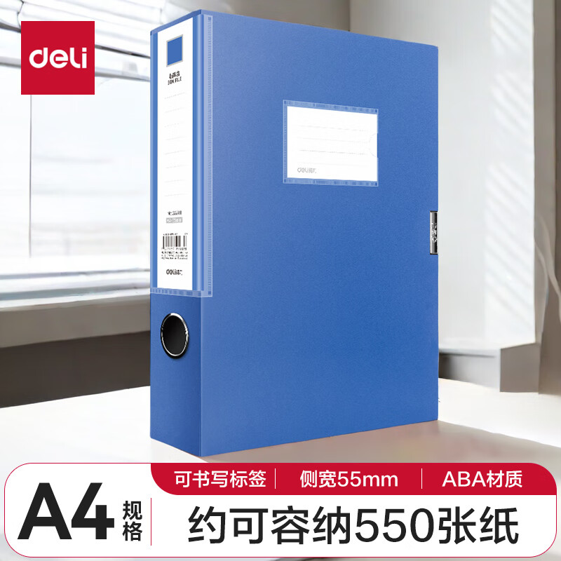 得力(deli)55mm单只装A4粘扣档案盒塑料文件盒 财会文件收纳资料盒 办公用品 33511 蓝色