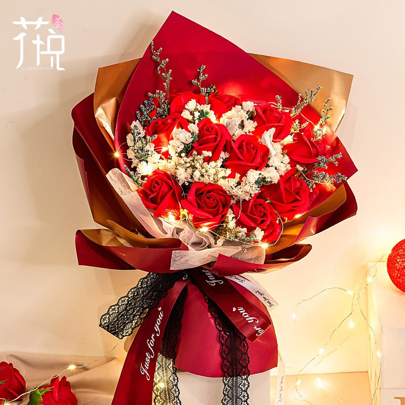 花悦荟11朵红玫瑰花束永生满天星生日礼物鲜香皂花同城配送女友老婆闺蜜